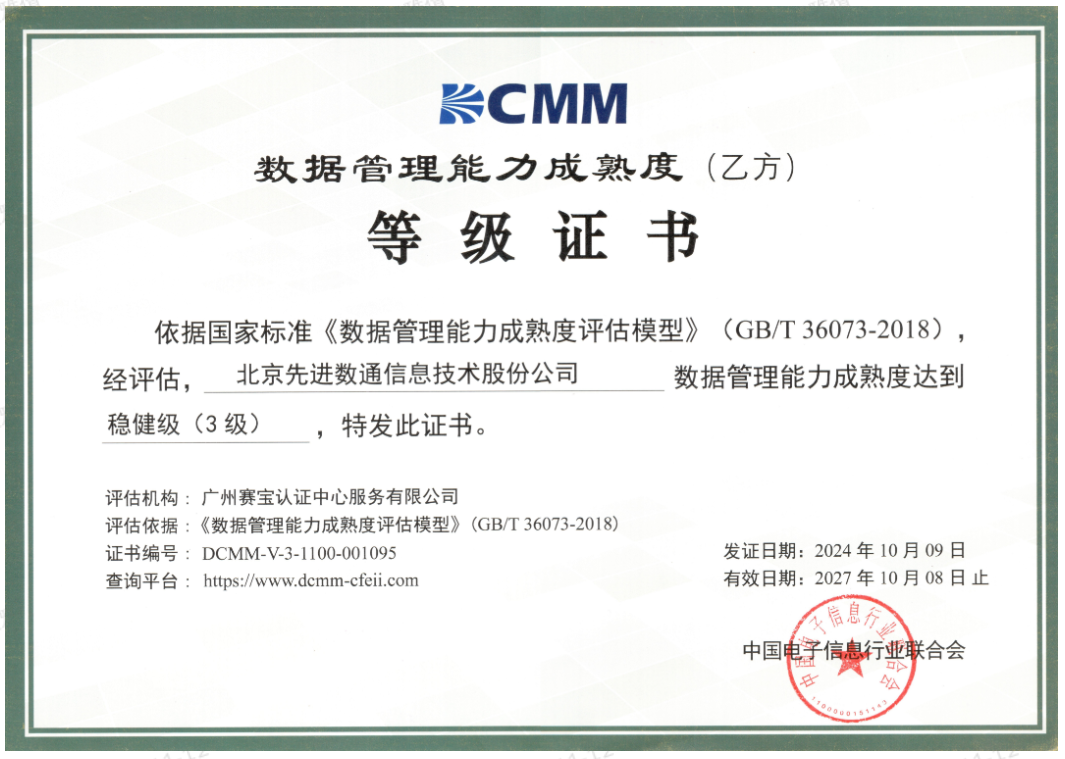 近期,中国电子信息行业联合会公布了最新一批顺利获得数据管理能力成熟度(DCMM)贯标等级认证的企业名单。米兰(中国)AC米兰成功取得数据管理能力成熟度稳健级(三级)认证。这一认证的取得,标志着米兰(中国)AC米兰在数据治理体系构建和数据管理与应用能力方面,已经达到了国家权威组织认可的标准。这不仅是对米兰(中国)AC米兰在数据管理领域专业能力的肯定,也是对其在有助于数字化转型服务和数据驱动决策方面所做努力的认可。